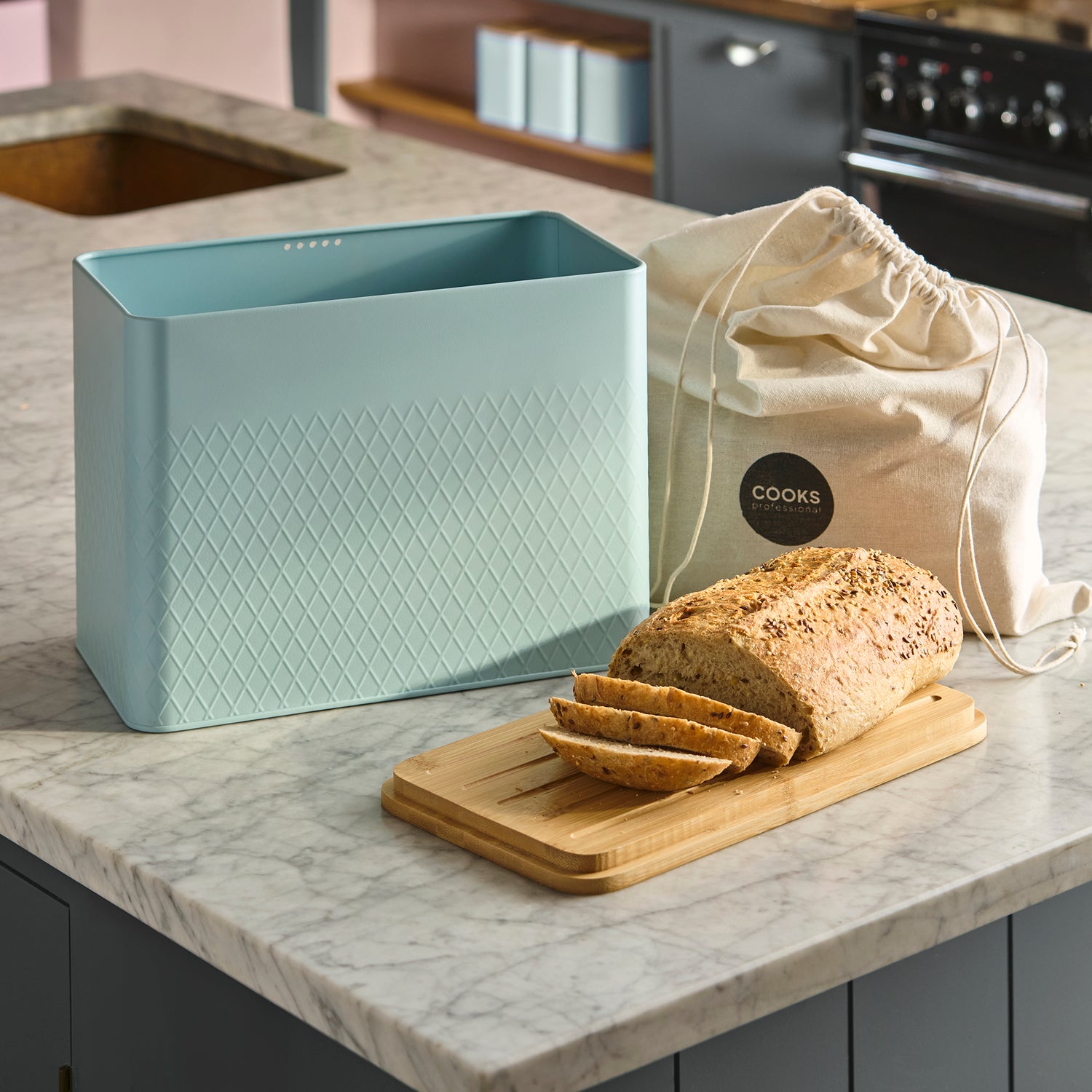 Cooks Professional Bread Bin, Linen Bag and Bamboo Board Set | Blue