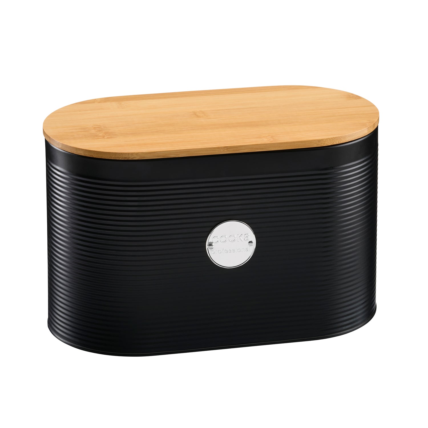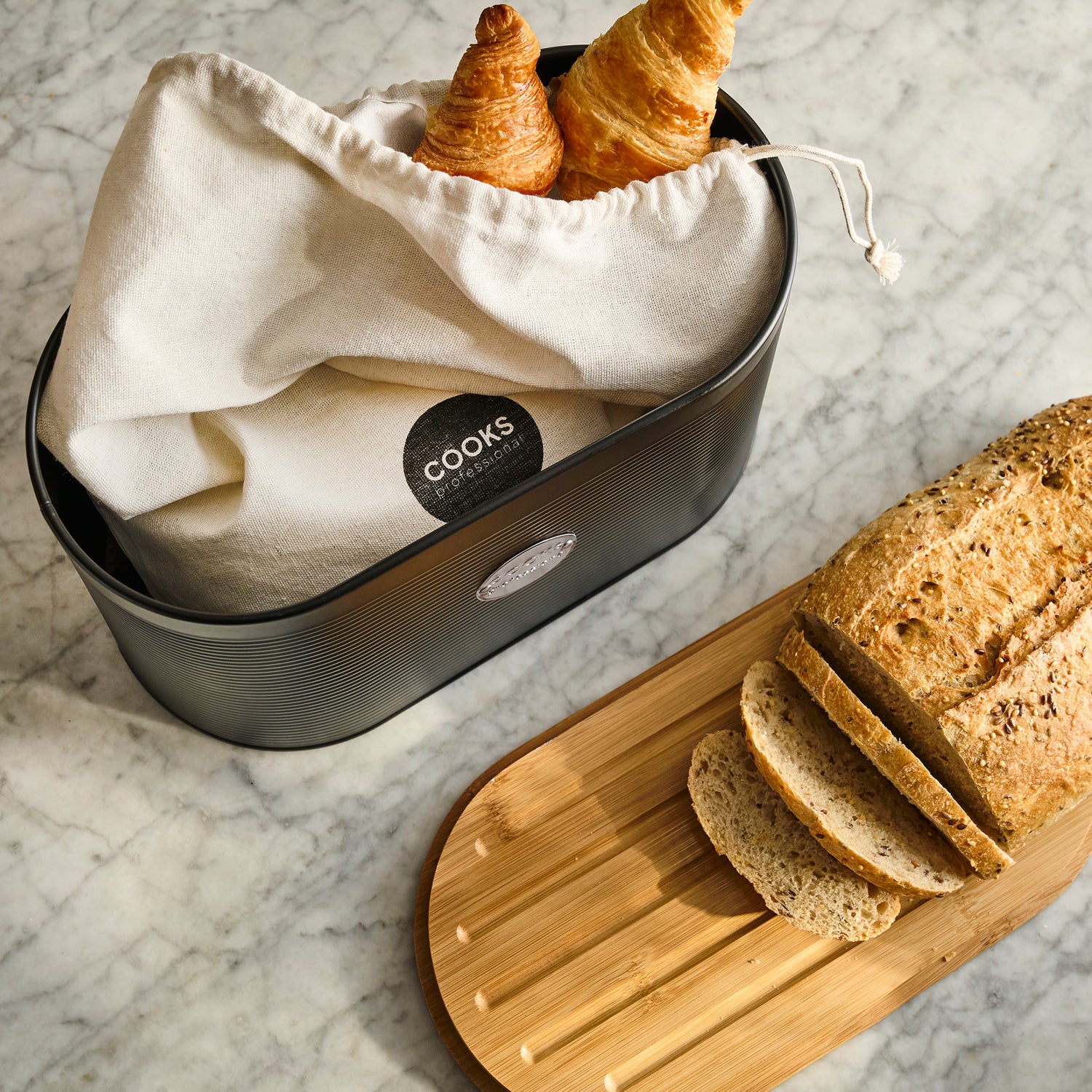 Cooks Professional Bread Bin, Linen Bag and Bamboo Board Set | Black / Silver